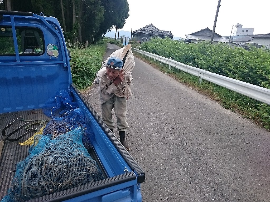 会社の周りの杉林から大袋を担いだおじさんがひっこり出現ビックリ!